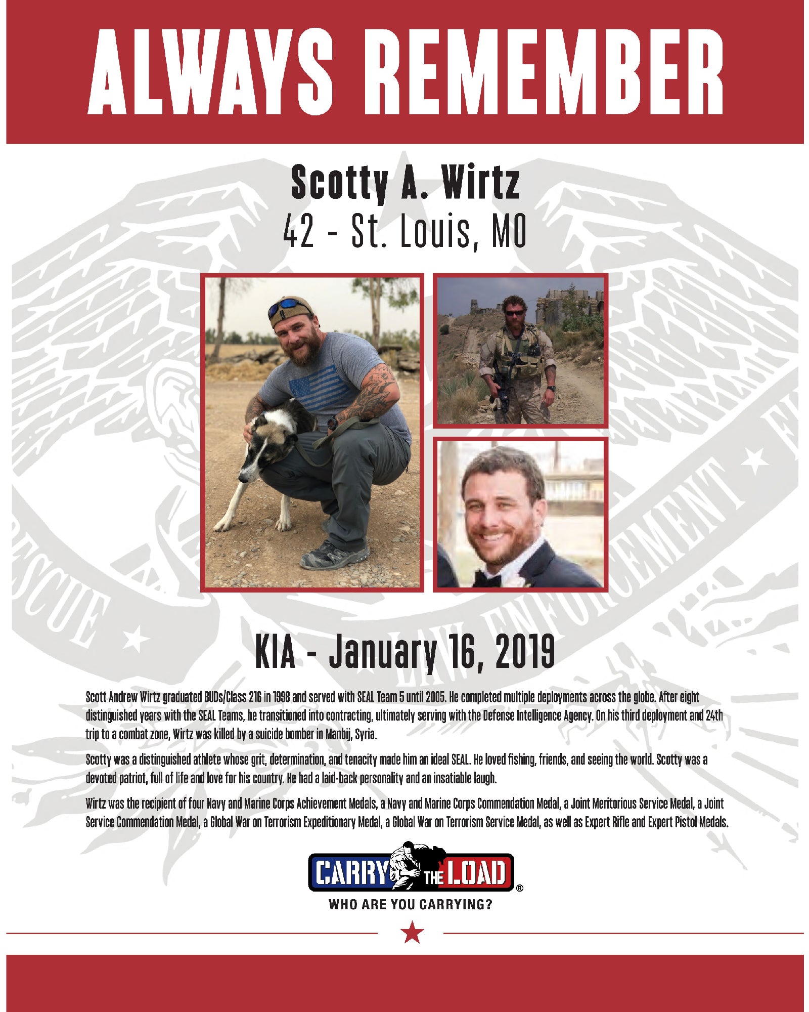 On Jan 16, 2019, Navy SEAL veteran Scotty Wirtz was killed by a suicide bomber in Syria.